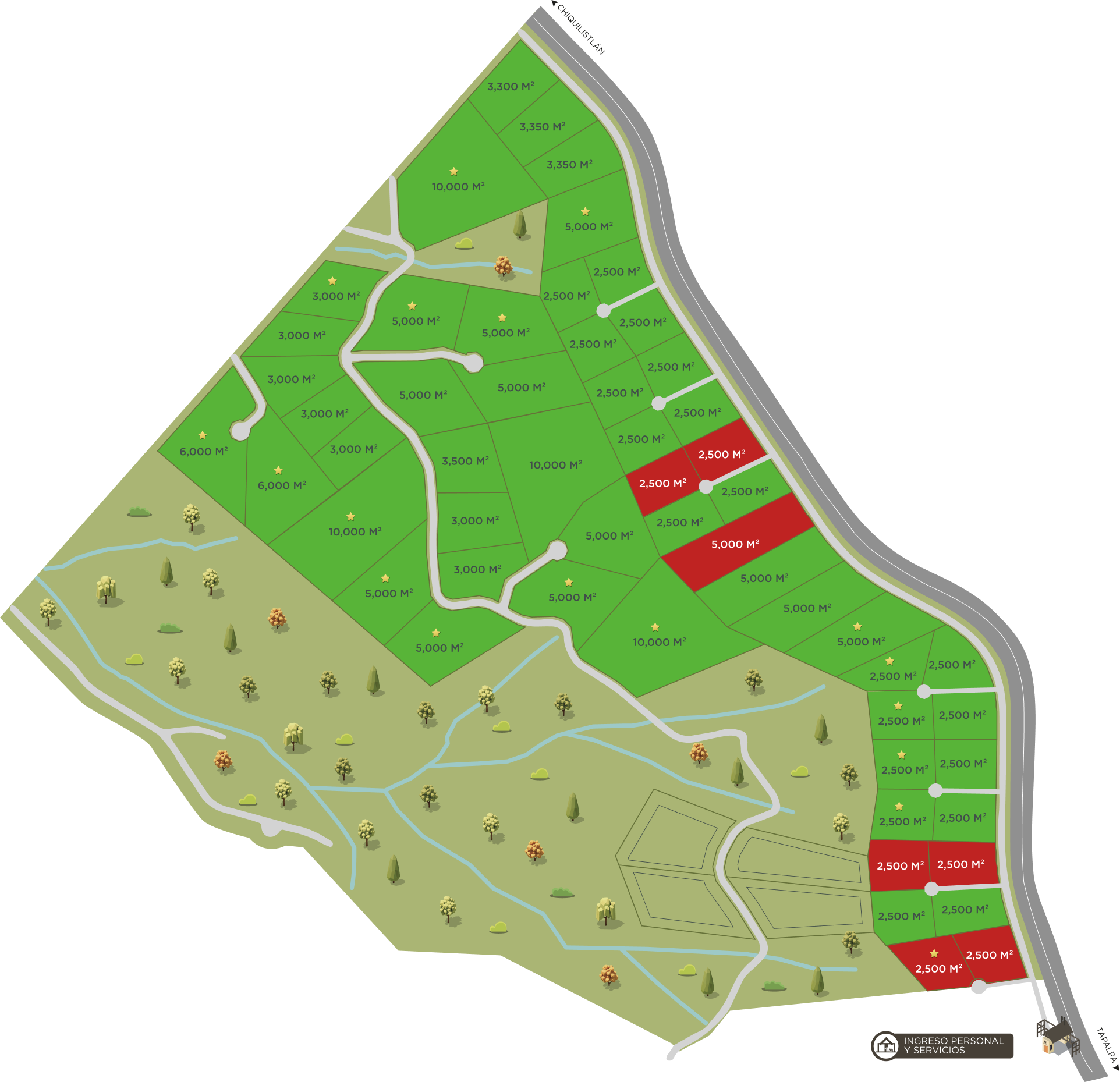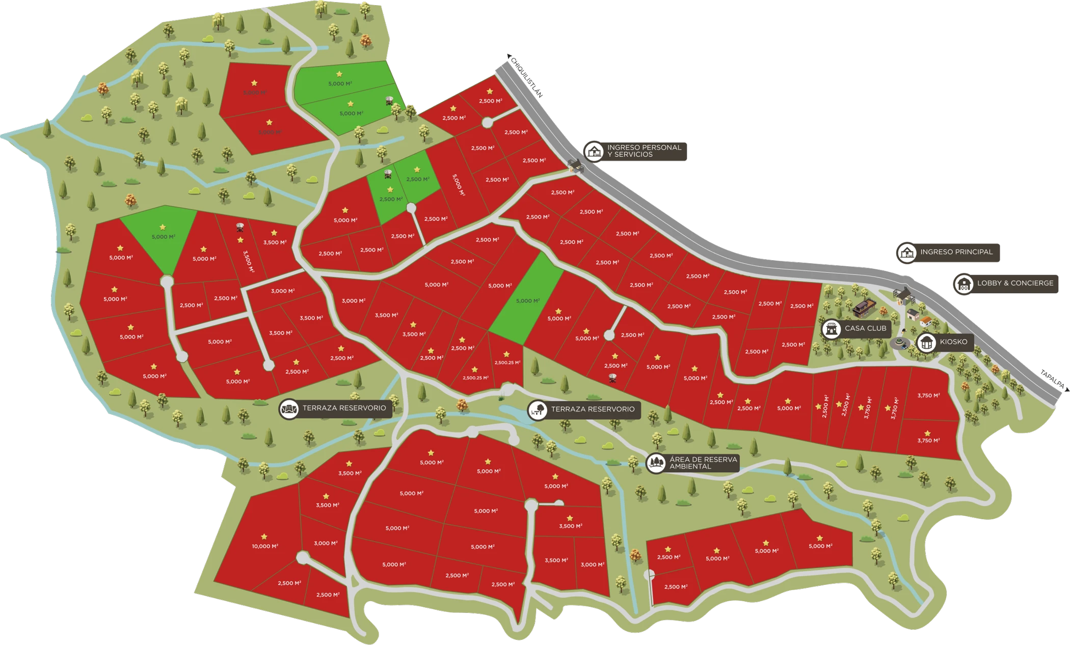 Cada terreno contempla una infraestructura completa, incluyendo agua, electricidad y caminos empedrados de alta calidad